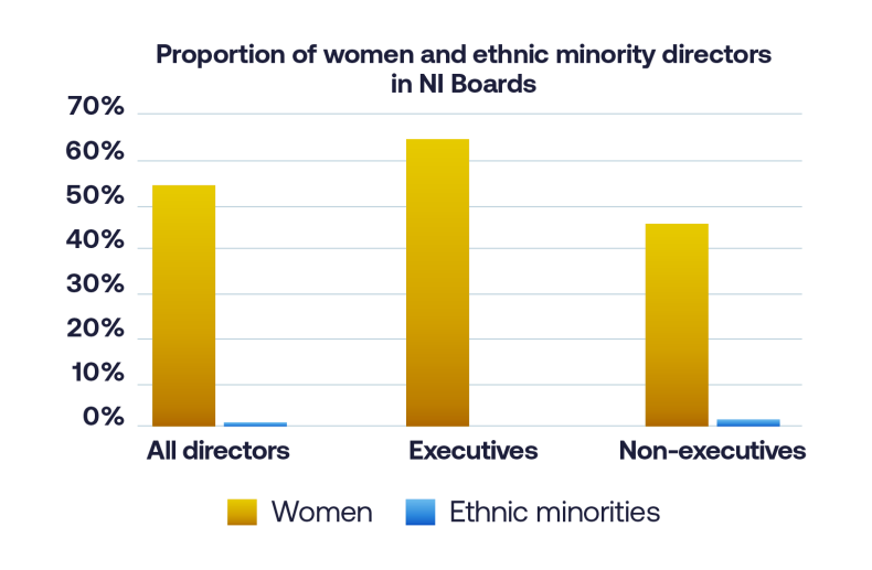 In Northern Ireland, although at a national level, figures for board directors are gender balanced, only two of the eight boards hit the EC definition. The remaining six are split evenly between having excess men and excess women. Seven of the eight boards are entirely white.