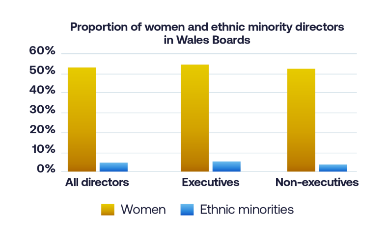 Data was analysed by assumed gender, assumed ethnicity, nation and ‘power roles’. In Wales, NHS boards have each individually met the European Commission (EC) definition of gender balance (with at least 40 per cent of each gender present) and at a national level the percentage of black, Asian and minority ethnic directors is representative of the population.
