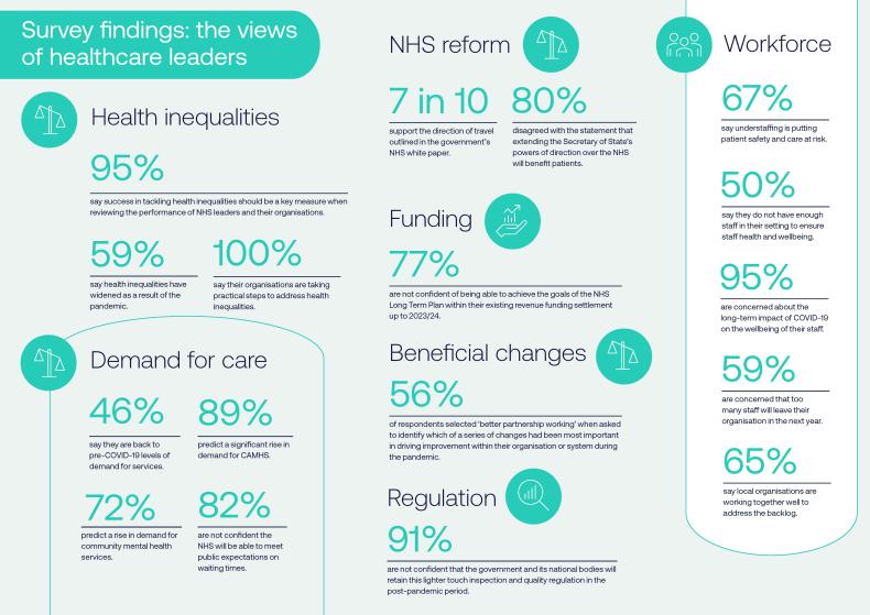 Recovering the backlog of care in sustainable ways that avoid overloading NHS staff and exacerbating health inequalities, while also managing public expectations about how long the recovery will take, is among the top concerns of healthcare leaders.